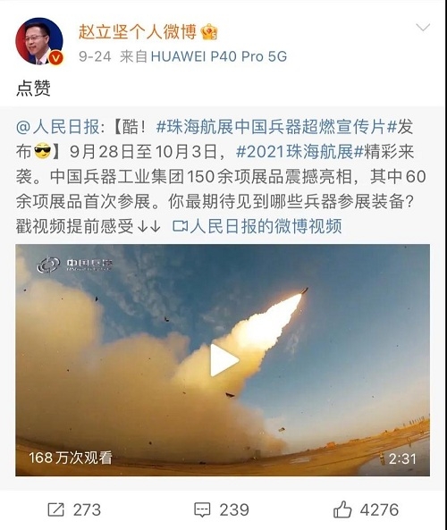 人民日報、新華社、中國日報、共青團中央、國資小新、騰訊軍事、鳳凰軍事、新浪軍事等新媒體發(fā)布的集團公司航展宣傳片等視頻作品燃爆全網(wǎng),閱讀量突破三千萬(wàn)人次,得到外交部發(fā)言人趙立堅轉載點(diǎn)贊。集團公司微信、微博、抖音號、微信視頻號等新媒體宣傳片播放閱讀量超過(guò)400萬(wàn)人次。同時(shí),央視新聞、新華社、中國之聲、央視軍事、央視新媒體、解放軍報、共青團中央、國資小新、環(huán)球時(shí)報等多家媒體對集團公司靜、動(dòng)態(tài)展區進(jìn)行現場(chǎng)直播,在電視端、客戶(hù)端、微信視頻號、微博、B站、快手、抖音等平臺受到高度關(guān)注。著(zhù)名軍事專(zhuān)家杜文龍、央視主持人顧國寧、央廣中國之聲主持人王藝等直播兵器館、動(dòng)態(tài)表演區裝備。